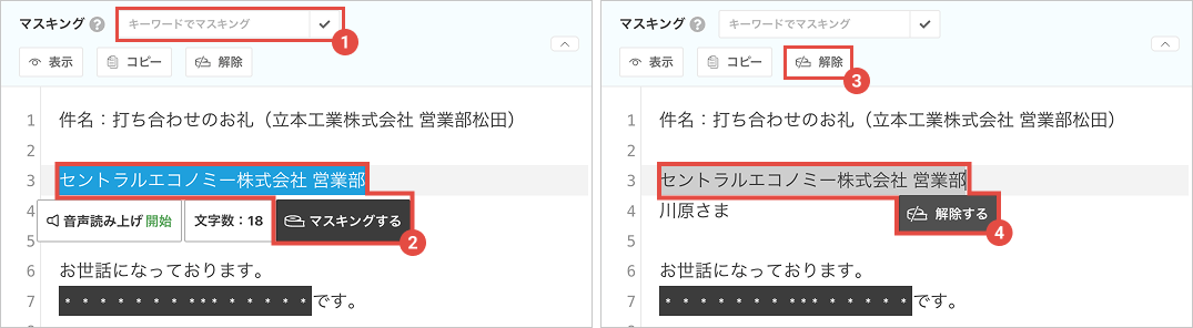 キーワードを入力して、特定の文字列を一括でマスキングするか、テキストエリア内で任意の文字列を選択することでマスキングできます。